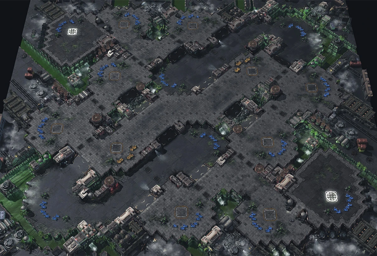 It's a standard-style map and is set in an overgrown chemical plant. There are many different options for expansion patterns past the nearest expansion, allowing for varied strategies[2]