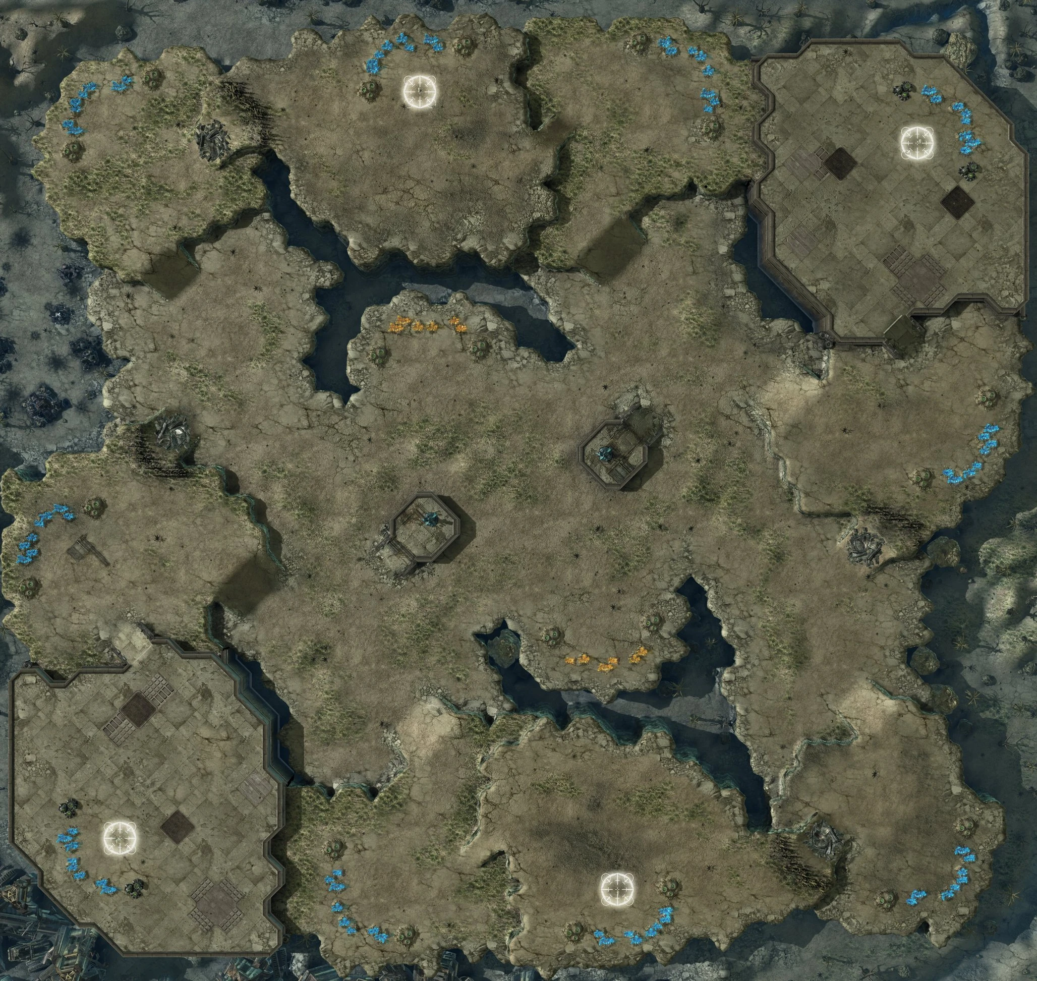 The wastes serve as a teamplay map for StarCraft II. Natural expansions are easy to control and rocks allow additional paths to the enemy.