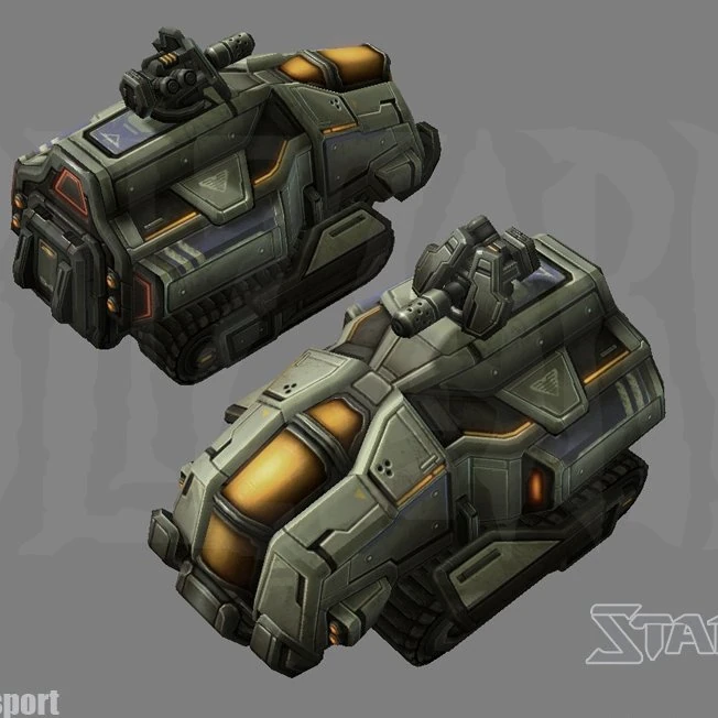 Concept art exists for a unit called the "armored transport" in Wings of Liberty. The armored transport was apparently under consideration for inclusion as a regular unit, specifically one high up the terran tech tree. While it had a weak attack, it had a high armor rating. It was only capable of transporting infantry.[9] In its final release, the APC's visual design was inspired by the shuttle from District 9.[10]