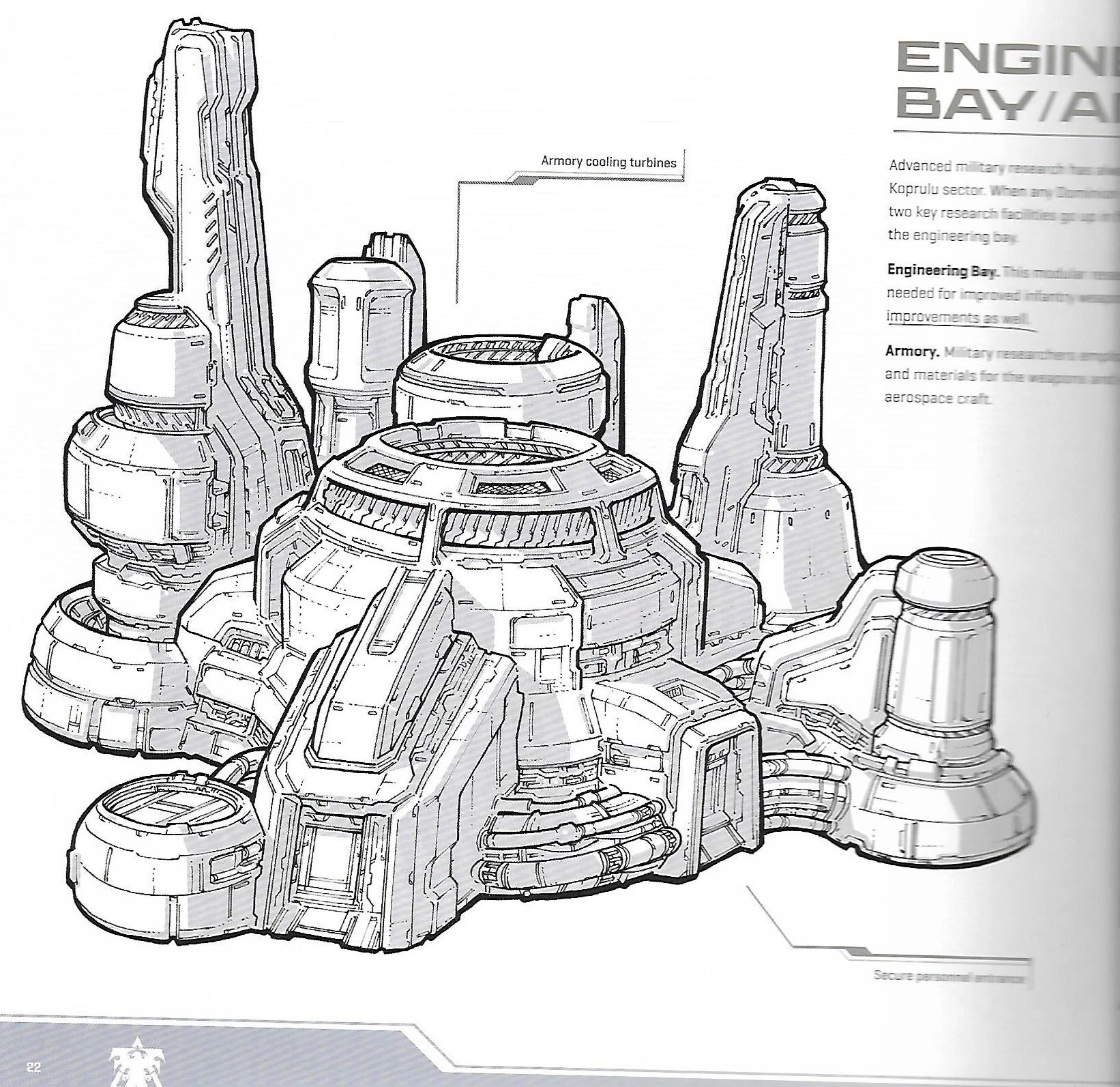 The armory is the structure where terran researchers and test groups work to develop improved materials for the weapons and armor used by terran vehicles and starships.[1] It contains several cooling turbines in the center of its structure, as well as a secure entrance on its side. Within the Dominion Armed Forces, whenever a strike force is deployed planetside, the armory is one of two key research facilities to be established in a field base as soon as possible (the other being the engineering bay).[2]