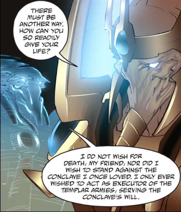 "I do not wish for death, my friend, nor did I wish to stand against the Conclave I once loved. I only ever wished to act as executor of the Templar armies, serving the Conclave's will. But fate has laid this path before me, whether I asked for it or not. I must embrace it for the good of our people. One day you will understand. All leaders must."