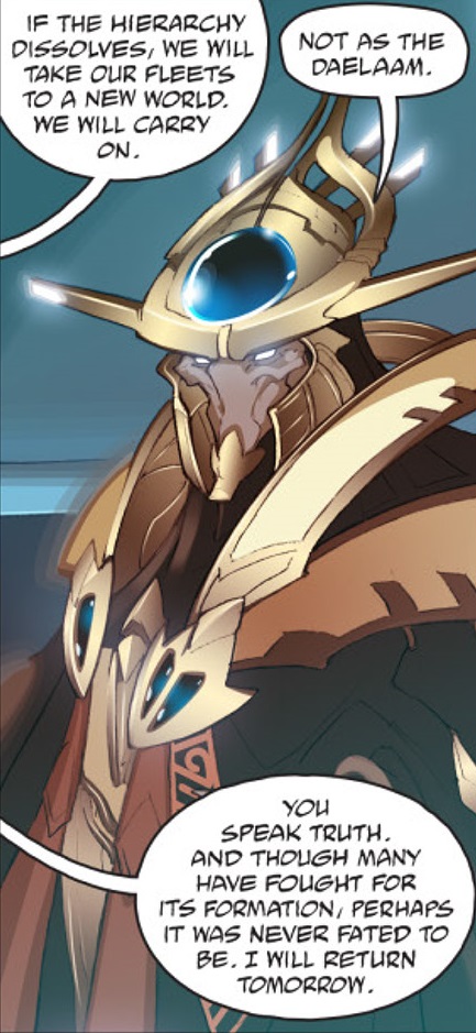 The next day came, and Artanis greeted the Hierarchy with silence. Tabrenus exclaimed that Artanis had obviously not chosen to become hierarch, and that he would leave at once. However, Artanis had indeed agreed to take on the role of hierarch,[21] the supreme leader of the reunited protoss.[61]