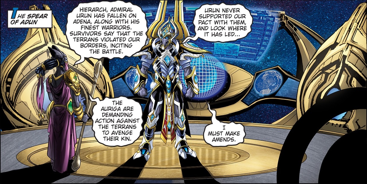 After the Battle of Adena, Artanis was made aware by the survivors of the protoss forces under Admiral Urun that he had fallen, and that they had come into conflict with terrans who had violated the demilitarized zone. Pressure mounted from the Auriga Tribe for action against the Terran Dominion. In response, Artanis pulled the Daelaam from peace talks.[118]
