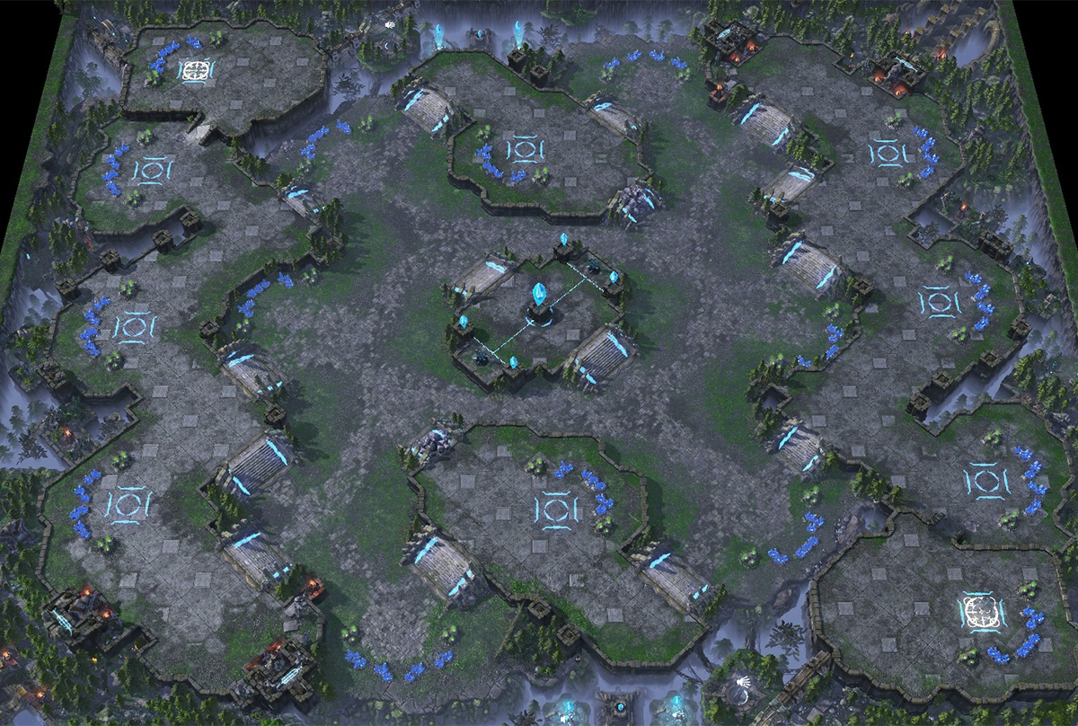 The map is focused on macro gameplay. It features a more constrained center with open areas around the sides of the map. Its base layout also allows for players to have lots of choices in how they wish to expand.[1]