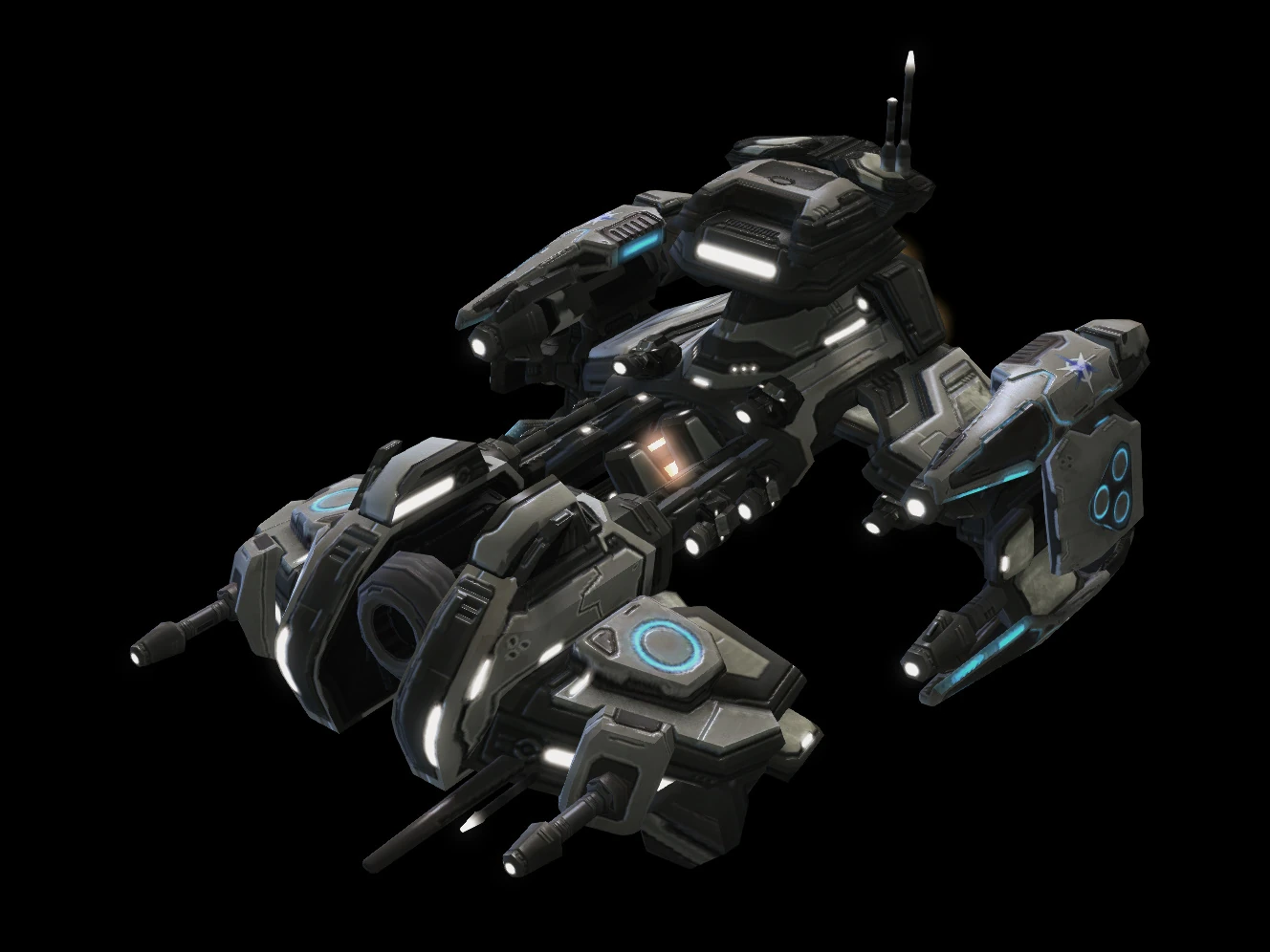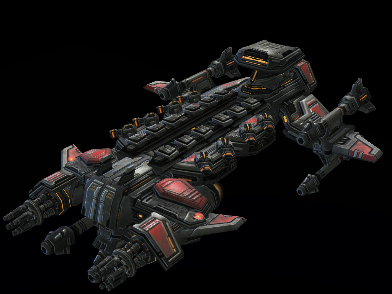 Battlecruisers stem as far back as the early days of the Terran Confederacy.[6] While there are many classes of battlecruisers, all are armed with lasers and protected by neosteel armor.[7] These laser weapons consist of multiple twin-cannon laser batteries for aerial defense and surface bombardment, located across the battlecruiser's hull. Its air-to-air guns—not as powerful as its air-to-ground ones—are equipped with advanced optics and sensors to deal with fast moving targets. The vessel's air-to-ground guns make use of electromagnetic coils to increase the potency of their shots.[8]