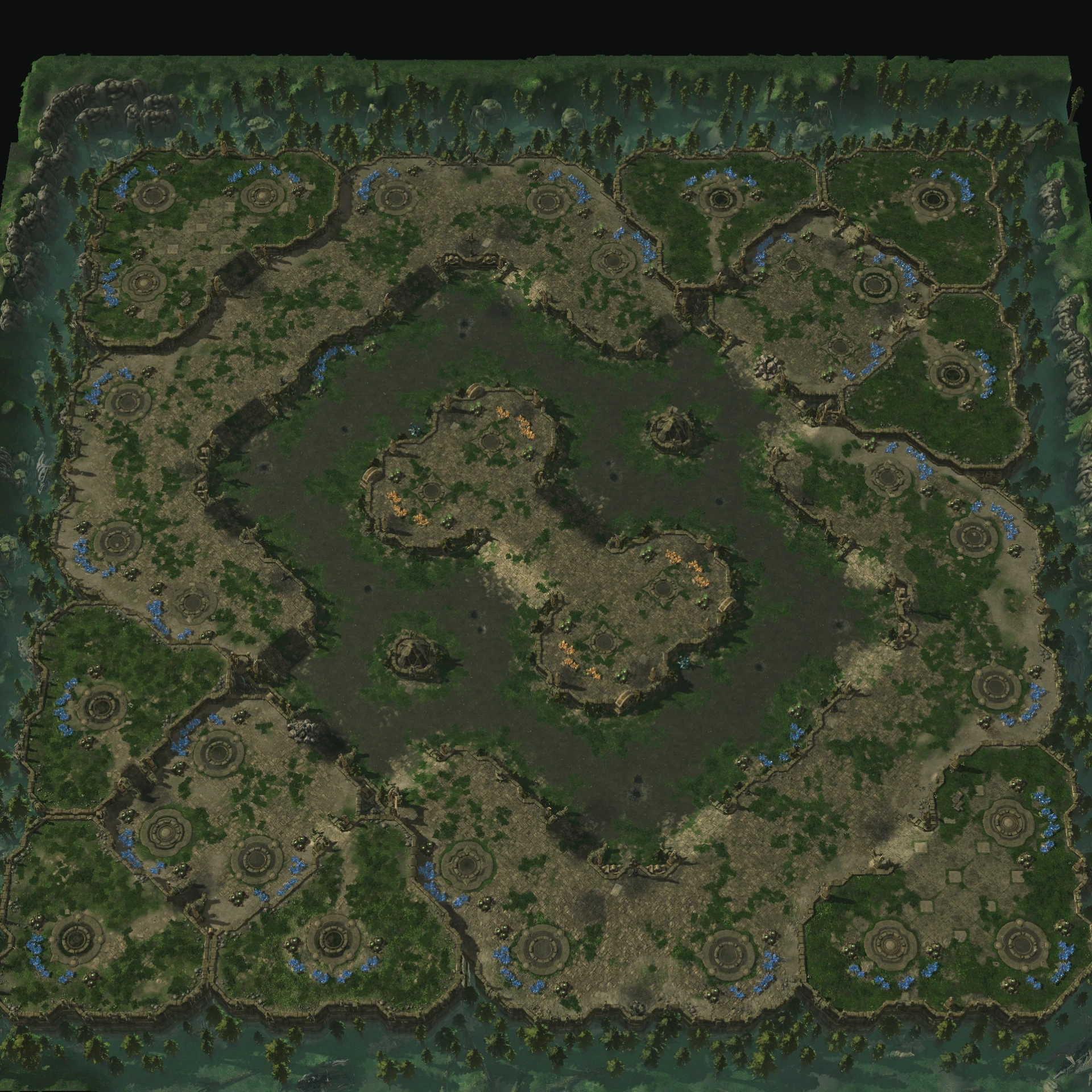 You can easily secure natural expansions on Bone Temple LE, but establishing third bases will require team coordination in order to hold successfully. Players can move through the middle to get to the enemy's base or take the alternate routes along the sides of the map.[1]