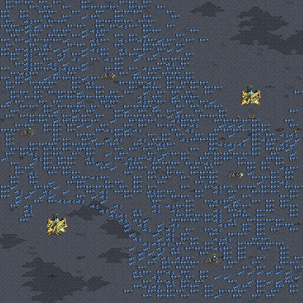 Huge portions of the map are covered with a forest of low yield mineral patches (all patches have 48 units) which prevent early game harassment. Continuous mining is required not only to acquire vespene gas but to open a path to the opponent.