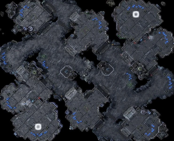 Xel'naga towers are situated on both sides of the destructible debris that covers the middle path, and give vision of an important area while still leaving one longer path accessible should you want to avoid it. They are also surrounded by fog, limiting vision if you do not control them. When one is expanding they are faced with a choice, to take an expansion far away from the main albeit being more defensible, or to take the closer, more open one. This lends itself to balance where you can expand based on your opponent, rather than being pidgeonholed into expanding a certain (sometimes undesirable) pattern. The map lacks gold bases, however the somewhat more open fourth expansion has a rich vespene geyser, allowing for faster gas harvesting. Hiding proxy buildings can be somewhat difficult on the map, but it is not crippling as the natural is still assultable without proxy.[2]