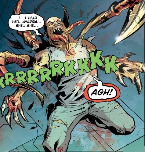 Gary rampaged through the town, leaving acid burned corpses in his wake. As he slaughtered a bar full of patrons, Elms caught up with him, and the two fought. Elms ducked to avoid his acidic spit, and grabbed the flamethrower of a fallen patron, and set him on fire. Gary shouted that the Swarm would rise again as he died in the blaze.[5]