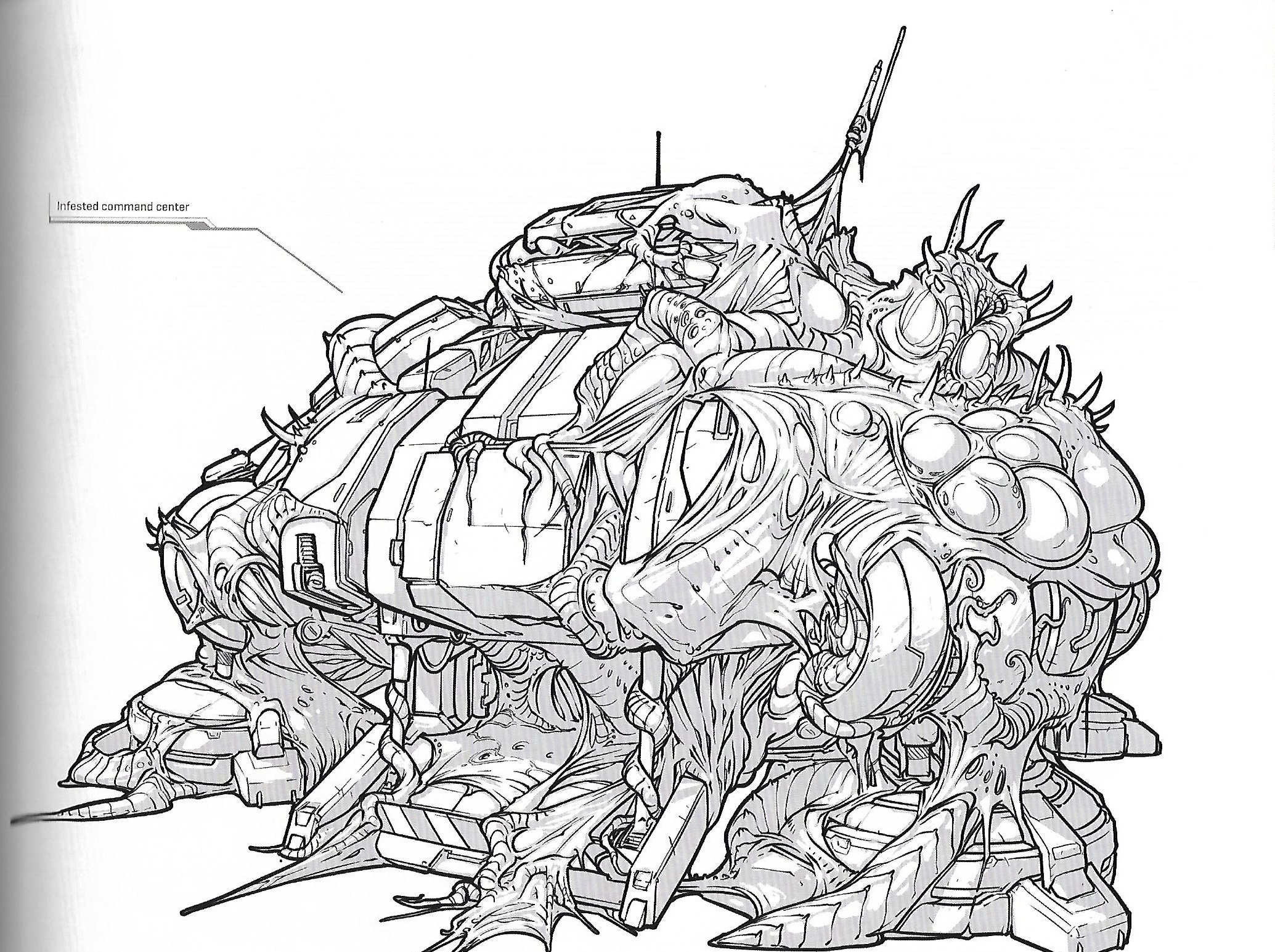 If a command center is heavily damaged, a queen may enter it and saturate the structure with parasitic bio-toxins. Once infested, the command center's occupants can be turned into mindless suicide soldiers.[1] The structure itself comes to be tangled by orange and green vines, with "sacs of messy proto-somethings" along the walls.[2]