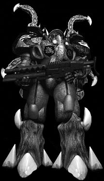In appearance, an infested terran looks "as if it had been redesigned by a madman who had too many spare parts left over from a variety of species." Growths and tentacles extrude from the body, with ruptured, sunken-in features and festering skin, albeit covered with carapace.[10]