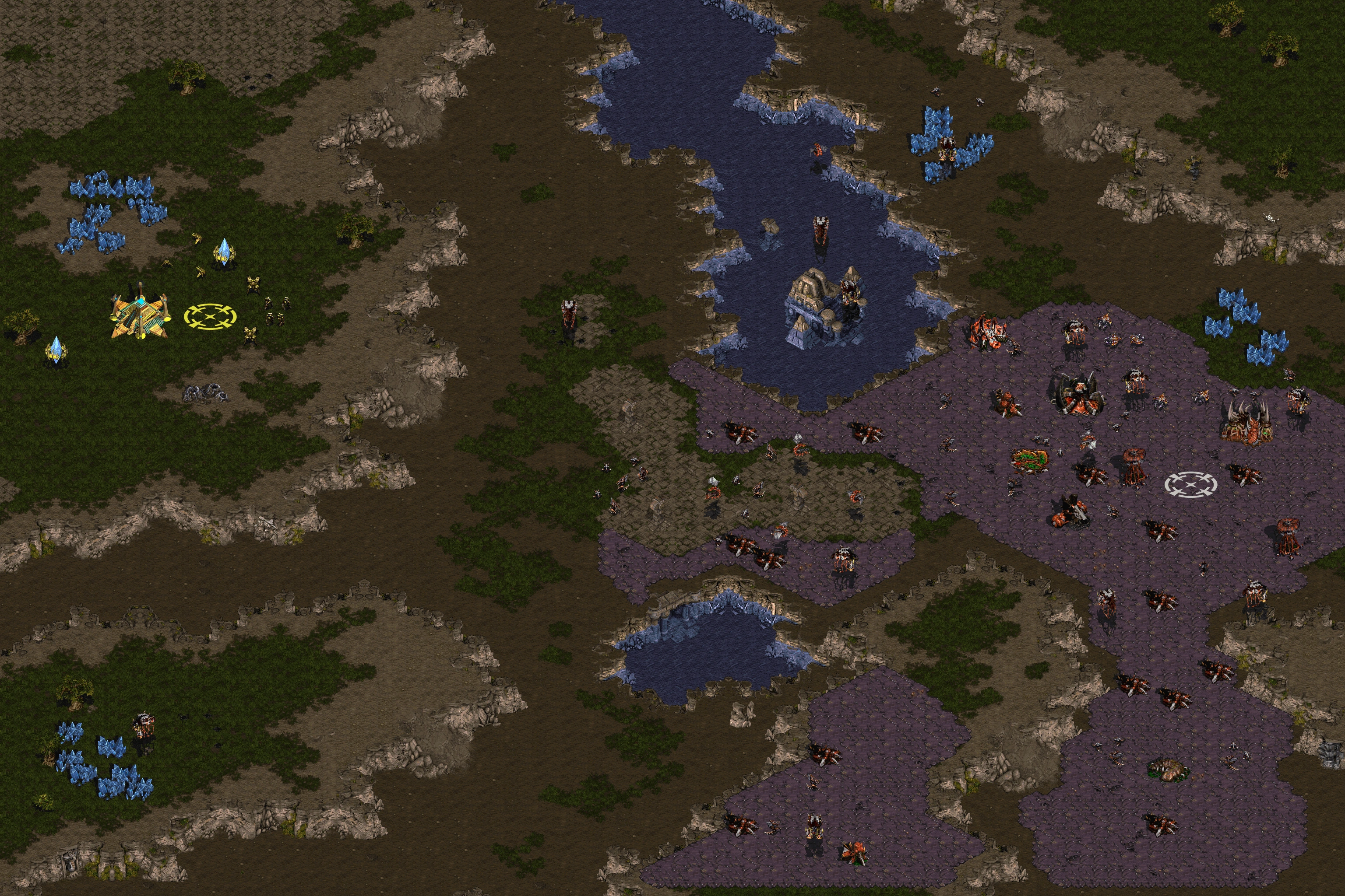 - One tactic revolves around simply rushing into the zerg base with a probe while being escorted by the starting 4 zealots and 2 dragoons to soak up damage for the probe. The goal being to get the probe to the open high-ground area to the left of the Cerebrate in order to build up to a Gateway there, and spam out zealots on the Cerebrate.