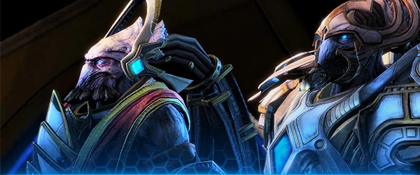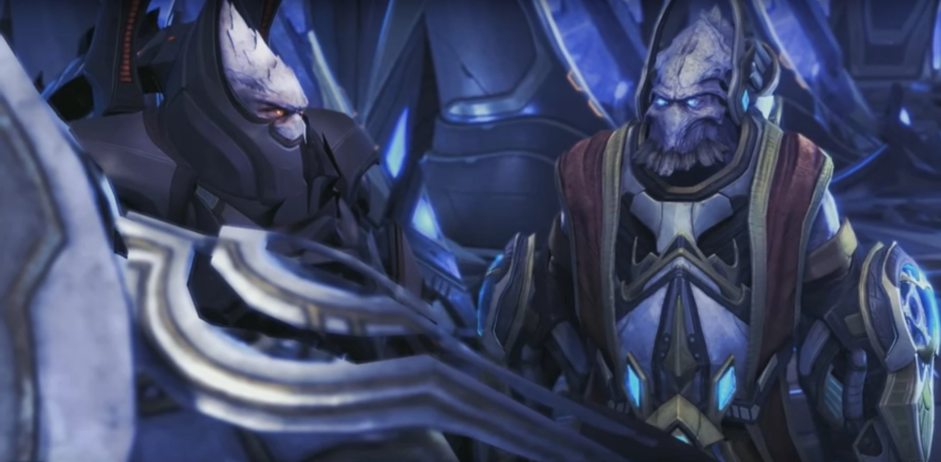 Karax alongside allied commanders lead Protoss forces against the forces of Amon.
