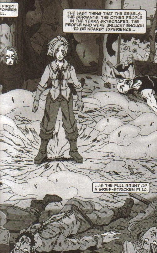 Nova returned to find that Edward Peters, Gustavo McBain, and other rebels were murdering her family and their employees. Peters ordered McBain to shoot Nova but now, with her psychic powers elevated by the mental stress caused by the carnage she had just witnessed, she unleashed powerful telepathic and telekinetic abilities without any control. A large section of the Terra Skyscraper was destroyed, and all of her would-be murderers, as well as many hundreds of nearby people, were killed. Nova then fled to "the Gutter," as far away from her former life as possible. The trauma of recent events led her close to suicide.