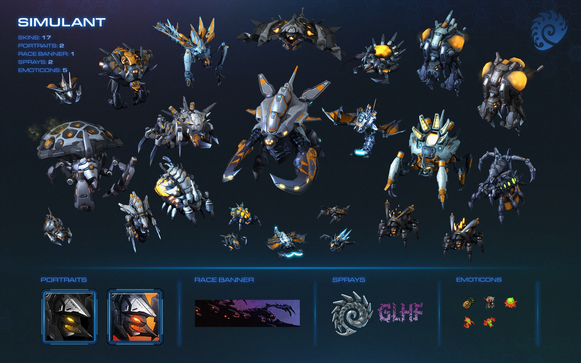 A simulant skinset was made available in the BlizzCon 2018 War Chest.[3] Project Simulant building skins were introduced in the Katowice 2019 War Chest.[4] Stetmann uses the Simulant skinset for his Mecha Swarm in Co-op Missions.[5]