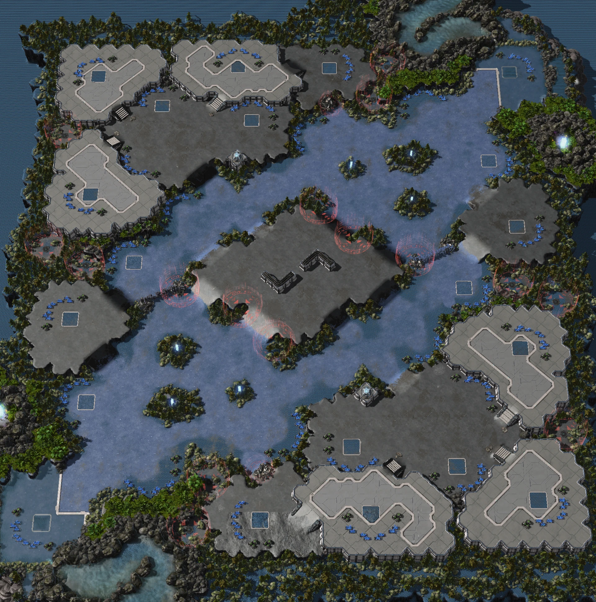 Players start with their own mains and do not share a fortress besides what holds their natural. With one player having a backdoor that allows them to take a third easily without having to go the extra mile. With all said and done this map has multiple chokes and fields to fight in, with direct middle being choked and Inhibitor Zone Generators to aid in defending.[1]