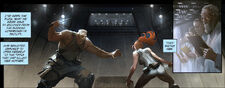 Sarah was taken to another room and strapped to a chair with a needle against her skin. In another room, she could see her brain-damaged father, similarly strapped to a chair. Rumm's scientists were about to inject her father with the same substance that caused the growth of a tumor in the kitten unless Sarah cooperated with the Confederacy. Instead, Sarah said she would kill herself and her father rather than use the power for the Confederacy. She was injected with the needle and quickly lost consciousness. Rumm felt he had no choice now but to employ the neuro-adjuster.[10][18]