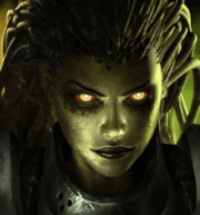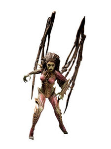 Sarah Louise[9][10] Kerrigan was a psychic terran female. She began her career as a Confederate ghost and later became the second-in-command of the Sons of Korhal.[11] Following Arcturus Mengsk's betrayal, she was captured and infested by the Zerg Swarm, becoming the self-proclaimed Queen of Blades[12] (a.k.a. the Zerg Queen)[13] and leader of the Swarm.[14] At the close of the End War, she would ascend to become a xel'naga, a being of immense cosmic power.[15]