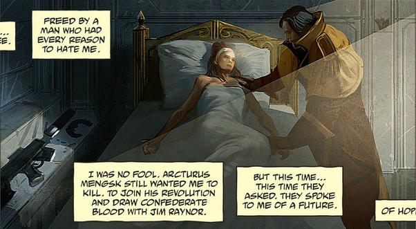 Upon awakening in Hyperion's sickward, Kerrigan was greeted by Arcturus Mengsk and Somo Hung. While Hung was smitten from the outset, she sensed Mengsk's animosity. However, Mengsk assured her she was a guest with full access to the ship.