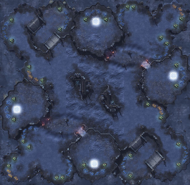 Rushing distances are short on this map, and the Xel'Naga Towers in the center make it easy to track enemy movement. Combined with expansions that are difficult to claim, this map encourages an aggressive game.