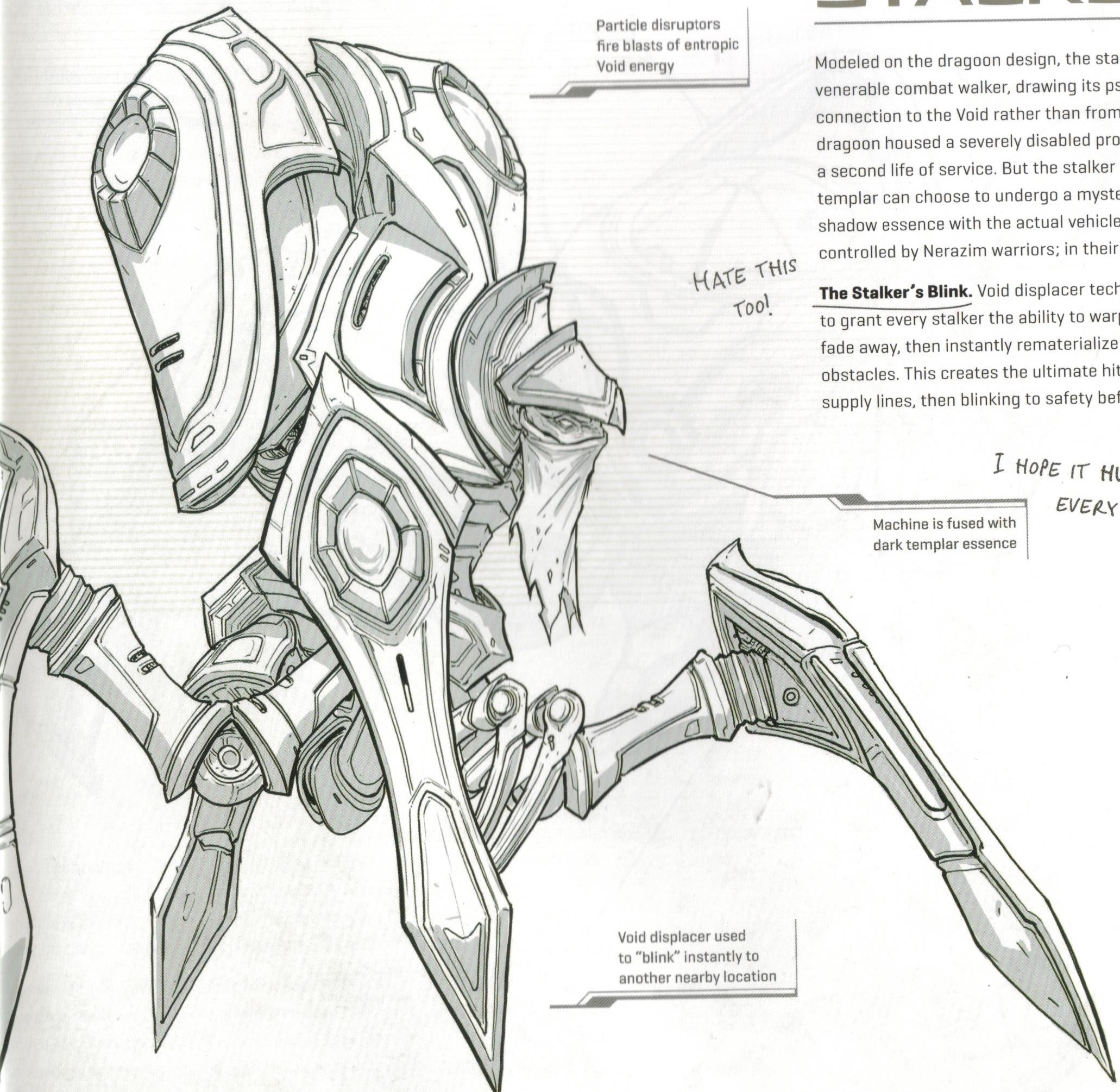 The idea for a "dark dragoon" stems back to the original game. When planning for StarCraft: Brood War and StarCraft 64, Samwise Didier pitched the idea of a Nerazim dragoon, but every time he would create concept art for it the art was scrapped. This concept would later become the basis for the stalker.[18]
