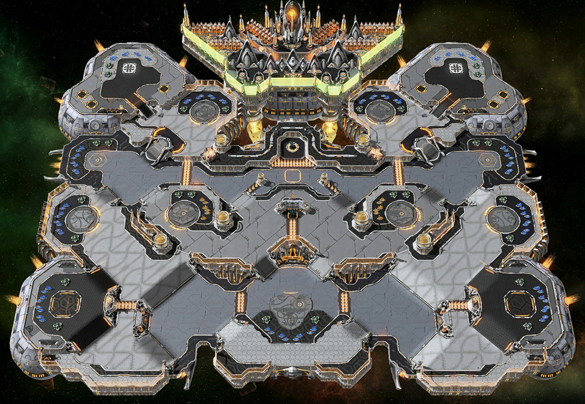 On this abandoned wing of the Purifier starship, you find yourself in close quarters with your enemy. Thanks to the watchtowers, gold bases, and a hidden path to the main bases, there is plenty to fight for from start to finish.[2]