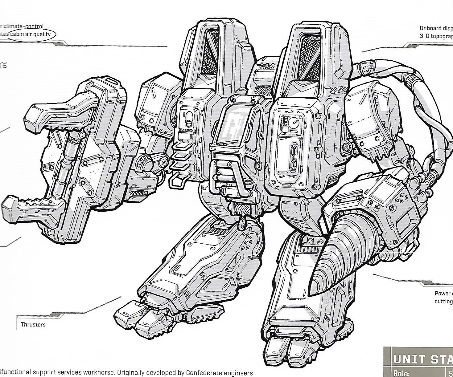 In order to defend a backwater world, SCVs were modified with combat apparatuses by engineer Yakov Iliev. This design would later be taken by the Axiom Corporation to create the warhound, a combat walker designed to combat heavy armor.[7]