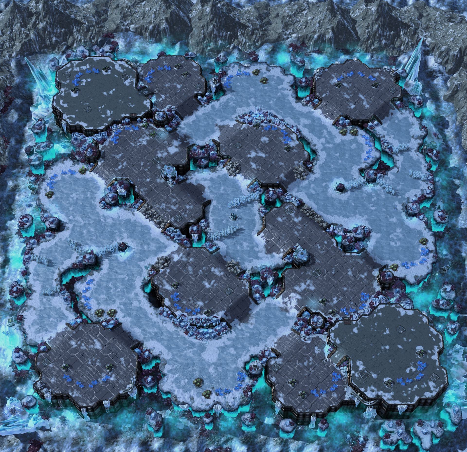 This map features a mixture of bases on high and low ground, set in a frozen outpost. A Xel'Naga watch tower in the center of the map gives vision of important attack routes. Bundle up![1]