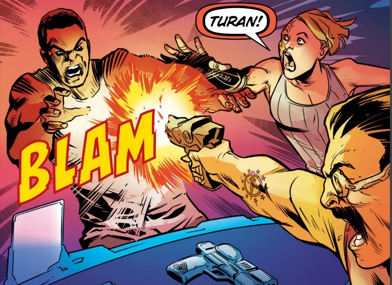 They arrived at the Last Junction, and Turan went along with Elms to meet her contact, James Sykes. Sykes agreed to help them find a buyer. Turan attempted to contact their dropship, but was met with interference. Sykes said he would clear it up for him, and shot Turan through the chest, killing him.[4]