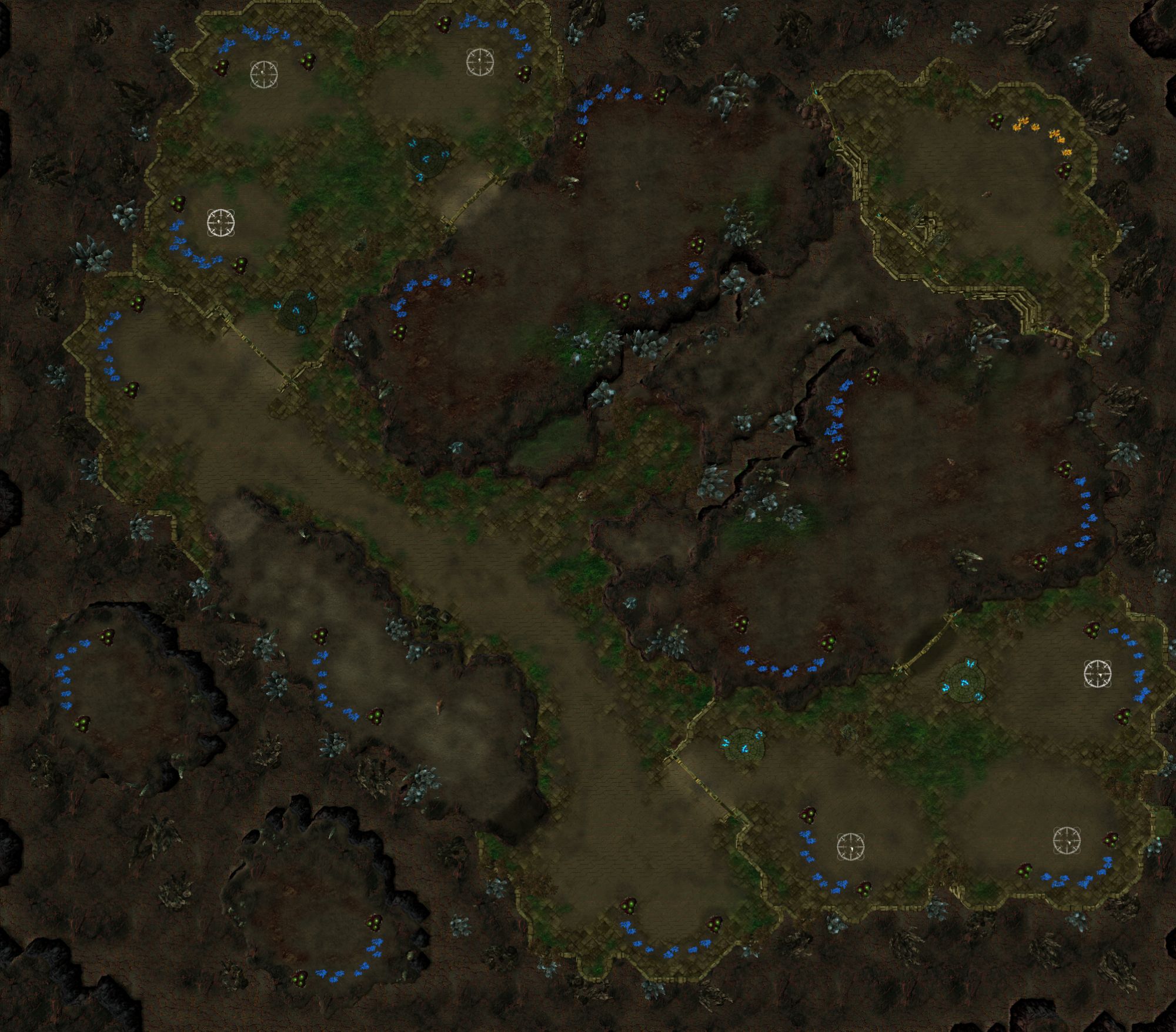 Typhon is a team play map in StarCraft II. Allies are located close to each other. There are two paths to the enemy. The high ground paths contains natural expansions and is secured by a rock. A xel'naga tower overlooks the low ground path, which is open to assault.