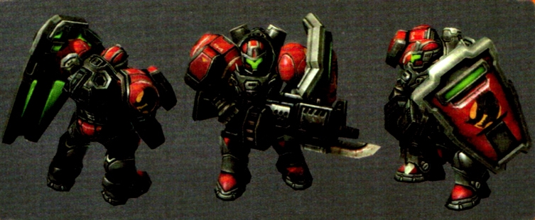 Increases the hit points of marines by 10. The marine model changes to have a shield attached to the left shoulderguard. The M98 combat shield is composed of 30 mm of bonded carbide.