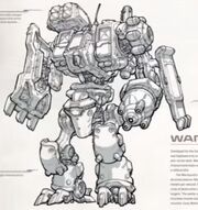 The warhound was developed after the first phase of the Second Great War after analysis of the battles fought, in order to better improve the terran war machine.[6] It was developed by Axiom Corporation, and prototypes were produced on Bukari V. The test was successful, in as much that the warhounds were able to display their firepower. Unfortunately for Axiom, the disgruntled workers turned their vehicles on the factory complex.[1] They were then deployed to high security installations.[3]