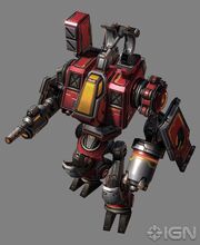 Missile racks are mounted on the warhound's shoulders, and cannon barrels are located on the end of its arms.[1] The missile racks are capable of firing either anti-air cyclone missiles[1] or haywire missiles, functioning as an anti-armor weapon.[5] For close-range anti-vehicle work, the warhound possesses a railgun that fires directed plasma field-charged slugs (DPFs), which are also capable of dealing with infantry and structures, is capable of firing ammunition at 3000m / s.[3] The warhound is capable of near-instantaneous toggling between DPF and anti-air ordnance systems, to address quickly changing threats in battlefield situations.